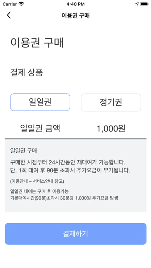 - 추가요금의 경우, 기본 대여시간 초과시 30분당 500원(정기권), 1000원(일일권) 부과