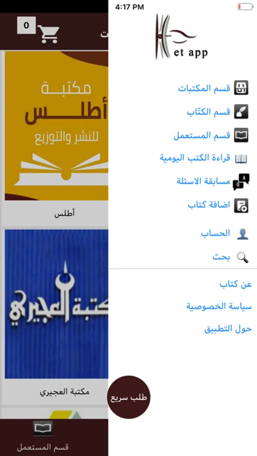 تمتع بتسوق الكتب الثقافية والعلمية من اكثر من مكتبة وكاتب عبر تطبيق كتاب مع خدمة التوصيل وتسوق الكتب الجامعية وغيرها المستعملة ويمكنك بيع الكتب المستعملة عبر تطبيق كتاب