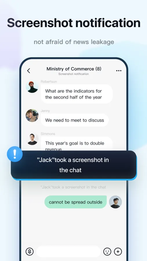 3.Screen capture notice: chat with friends or group chat. If someone takes a screen shot, the system will inform someone that the screen has been taken.
