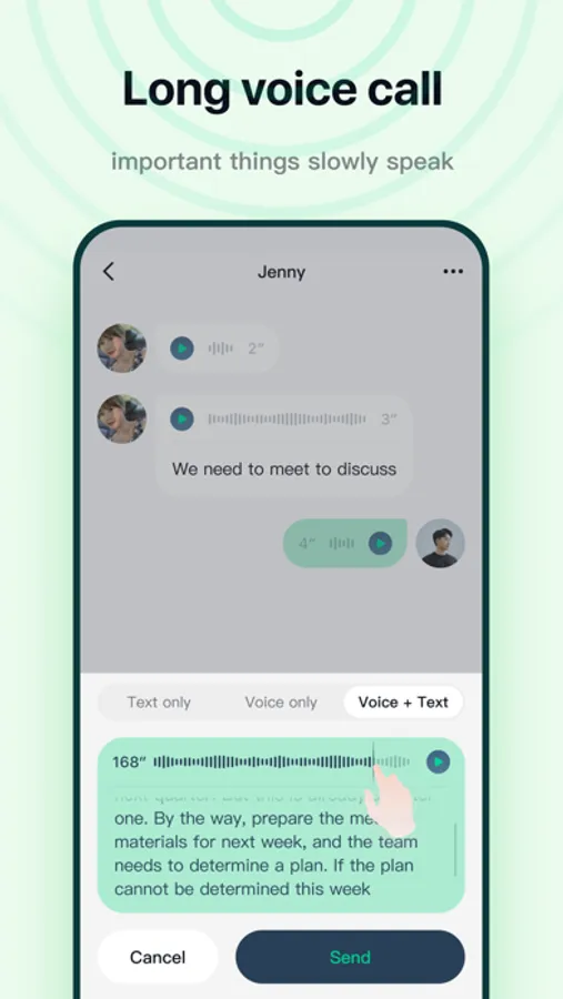 10.Voice + text: sending voice can be replayed and repeated listening, and voice + translated text can be selected to send together, so that the receiver can directly view the voice.
