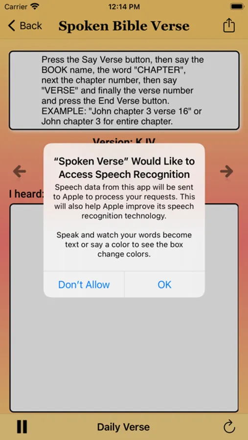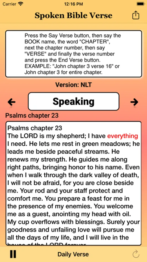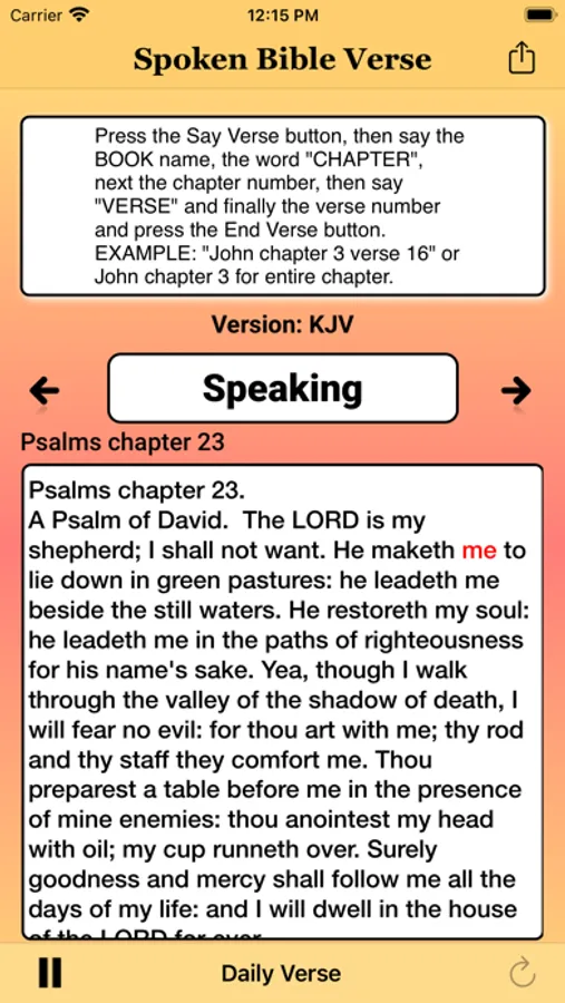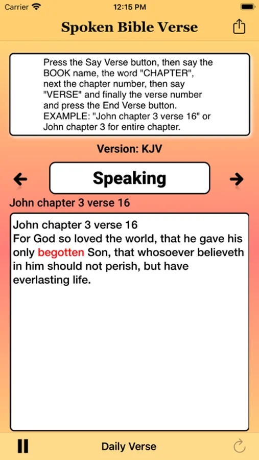 Words are highlighted in red as they are spoken. The Daily Verse button may be pressed repeatedly for multiple verses. A repeat button will say the verse again.