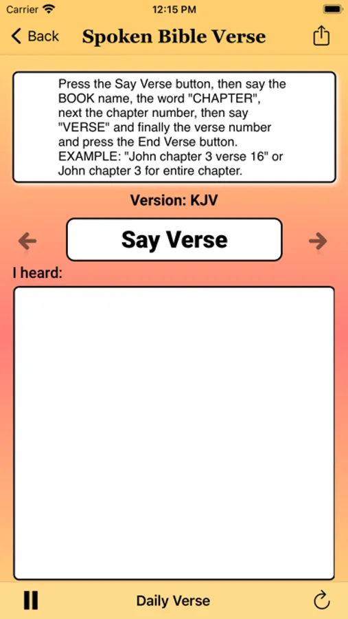 The Daily Verse button in the middle of the lower menu bar will play a key verse of the day. You can repeat this verse, use the next and previous buttons to hear the verses around it and the share button to post it to your favorite social media site.