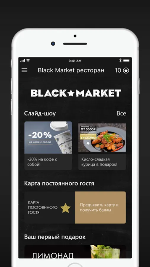 Black Market- ресторан современной гастрономии, где представлены блюда разных культур, в нашей интерпретации. В меню гармонично сочетаются стейки из говядины породы Black Angus, фирменные бургеры, паназиатский wok и роллы, а так же десерты ручной работ. В основе концепции – оригинальная подача блюд, строгий отбор лучших поставщиков и атмосфера, располагающая к комфортному отдыху в кругу семьи и друзей.