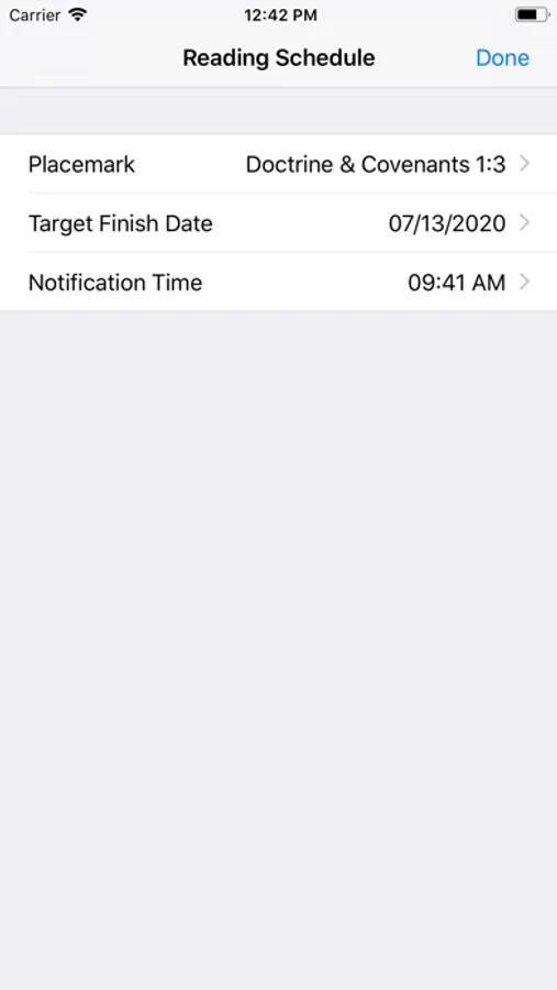 Start by picking a finish date, place your bookmark in the Doctrine and Covenants, and you're ready to start. Daily notifications let you know when it's time to read and how much you need to read to reach your goal.
