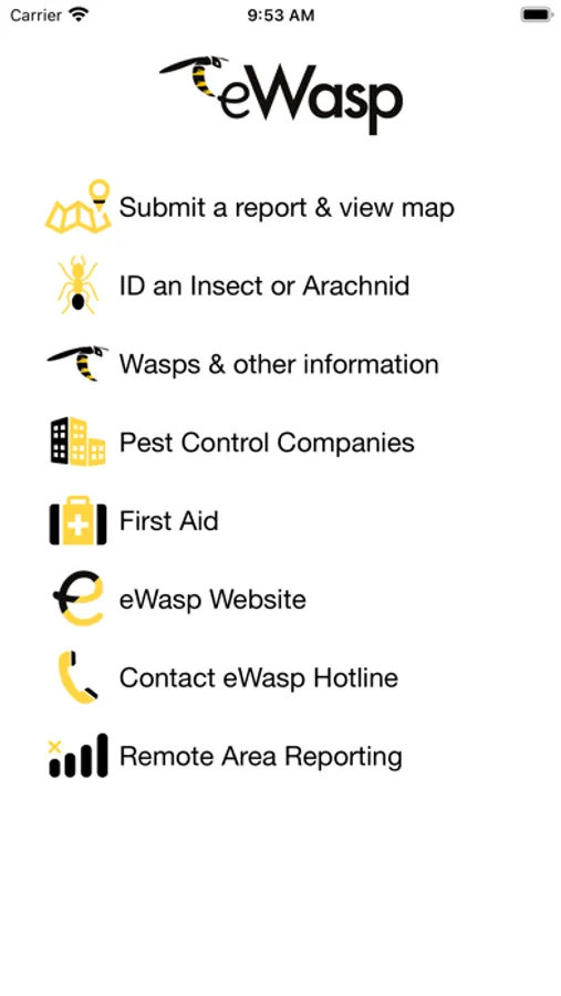 Upon opening the app, users will see a main menu with a list of options to select from. Once a report is submitted, the report is sent to the eWasp Team to action.