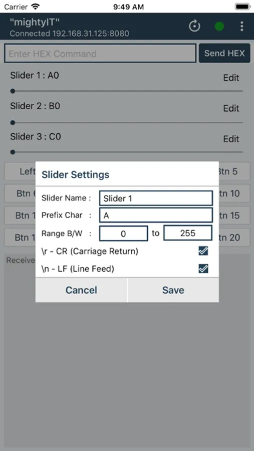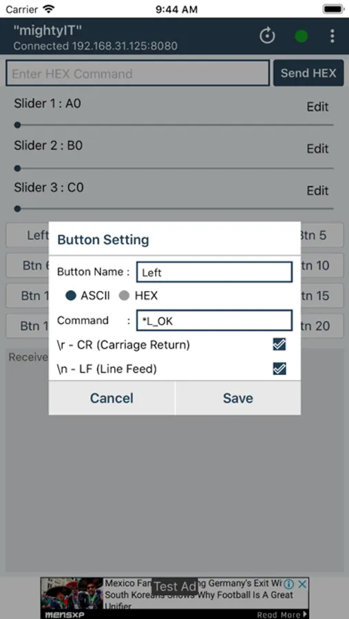 - By, Long pressing of any button you can custom your own buttons for frequent sending of same data.