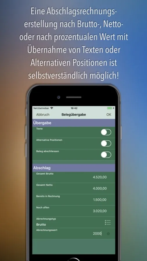 Bürospezifische Arbeiten wie Angebote kalkulieren, Aufträge, Aufmaße, Teil- und Schlußrechnungen erstellen, erledigen Sie mit dieser App einfach und schnell, offline und unterwegs oder direkt bei Ihren Interessenten und Kunden.