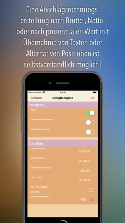 Bürospezifische Arbeiten wie Angebote kalkulieren, Aufträge, Aufmaße, Teil- und Schlußrechnungen erstellen, erledigen Sie mit dieser App einfach und schnell, offline und unterwegs oder direkt bei Ihren Interessenten und Kunden.
