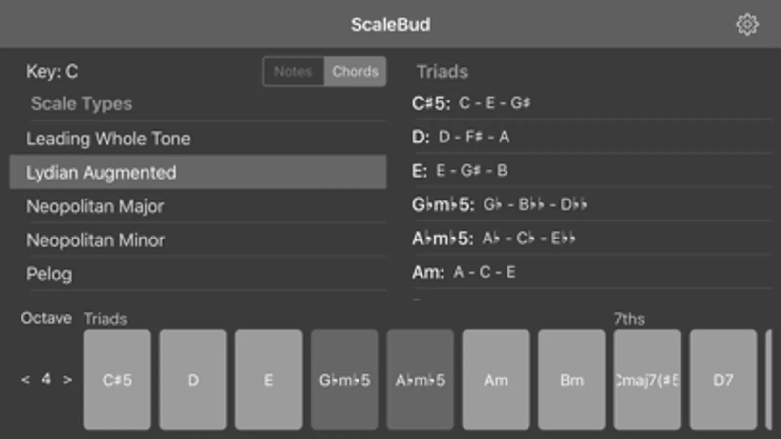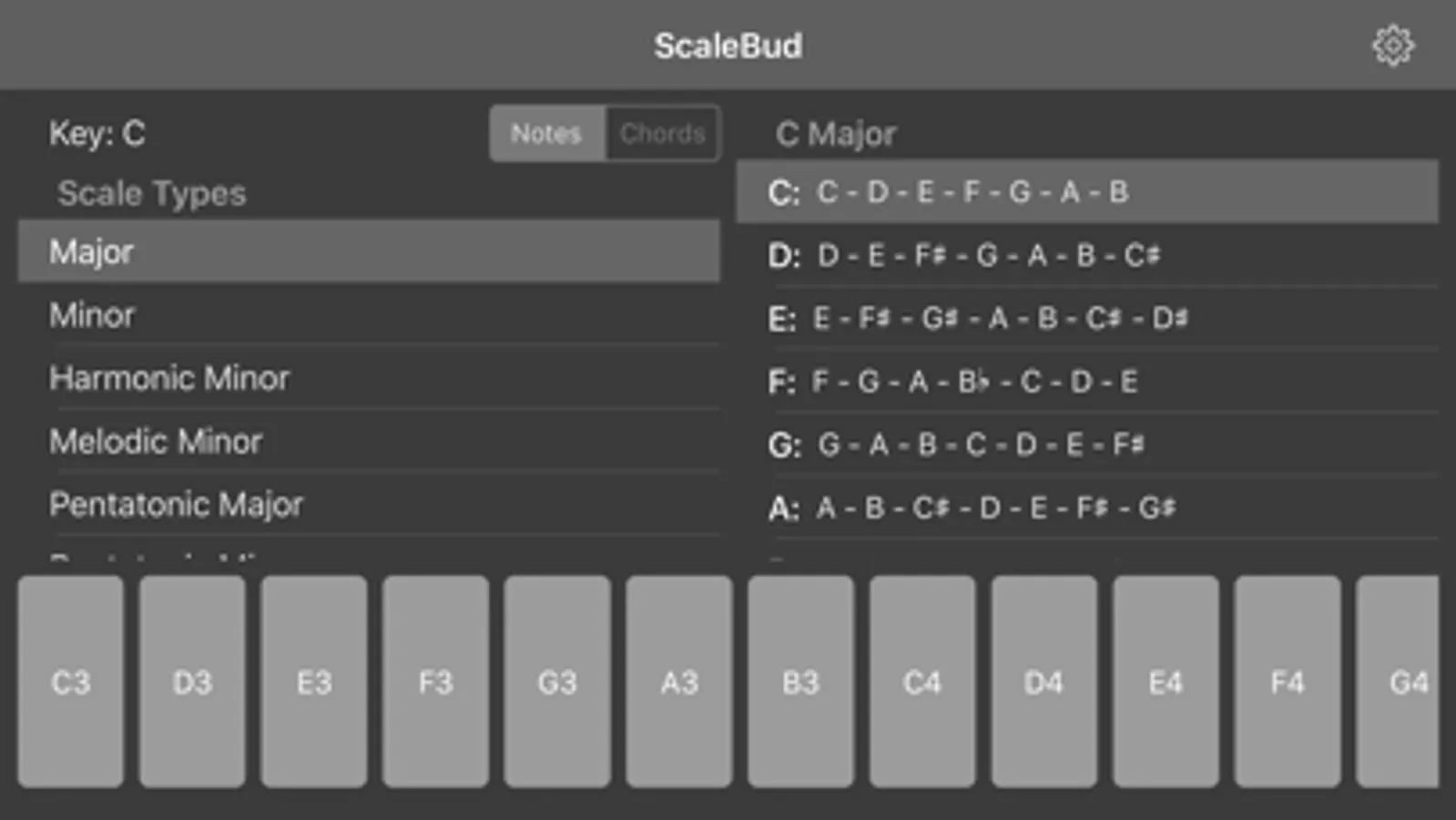 It has a very simple, single-view interface that you can choose the scale and key you want to work as well as note or chord mode selector on the left side. Right side lists the scale notes or chords you want to work with. In note mode, you can fastly jump between notes in the scale by selecting them from the list. In chord mode, you can see the triad, 7th, 9th, 11th or 13th chords for each note in the scale. You can jump between them quickly as well, by pressing the chord you want to play from keyboard. Also, in chord mode, you can set the octave you want to play for the chords from left side of the keyboard.
