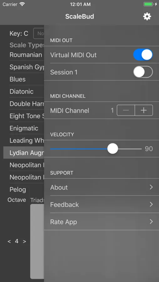 ScaleBud comes with an AUv3 MIDI plugin and standalone versions. You can directly control your iOS, Mac or PC audio apps with CoreMIDI. Just open the settings menu and select the MIDI Out you want to send MIDI to.