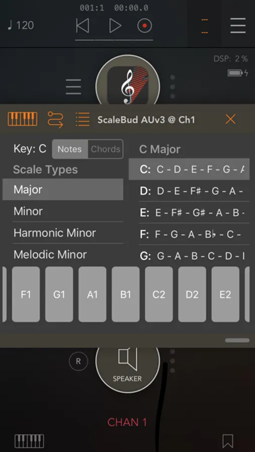You can use ScaleBud with Audio Unit version 3 hosts like Audiobus 3, AUM, Cubasis 2, Beat Maker 3, apeMatrix and Sequencism. As an audio unit plugin, it both maps/filters your MIDI Input to the MIDI Output you route, and sends the notes/chords you pressed from its keyboard. In chord mode, you can press any type of chord from the list in order to make chorder generate chords in that type. For example if you press a 7th chord, it will generate 7th chords for each note you send it from your MIDI keyboard.