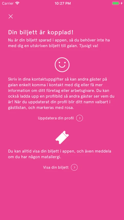 I appen får du aktuella nyheter, praktisk information och presentationer av de nominerade. När du scannar din biljett i appen så får du tillgång till fler funktioner. Då kan du låta andra gäster se mer information om dig, ladda upp en profilbild, samt meddela oss om matallergier. Du kan se mer information om andra gäster och vilka som sitter vid ditt bord. När du kommer till galan har du biljetten sparad i appen, och du får hjälp att hitta till ditt bord.