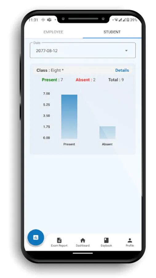 In this section of the application, you can view the total number of students present and absent in each classroom. You can also view the name, ID and phone number of all the students in this section.