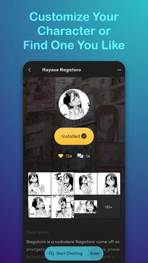 This app (Kajiwoto) allows you to create and/or adopt your favorite characters into a personal AI companion that you can chat and interact with. You can install datasets and skins (appearance) that you created yourself; or you can use our marketplace to buy and sell datasets/skins created by other users.