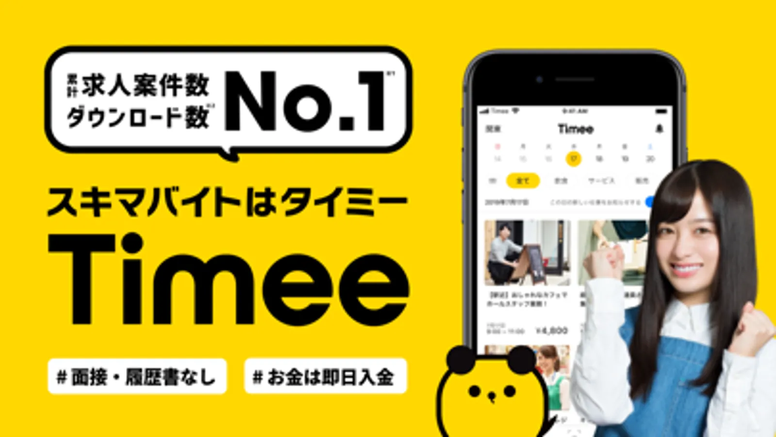 「タイミー(Timee)」は空き時間に面接や履歴書なくすぐ働けてすぐお金がもらえるスキマバイトアプリです。