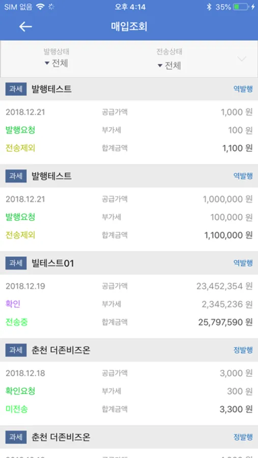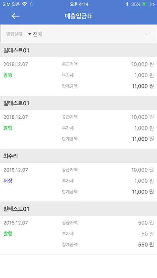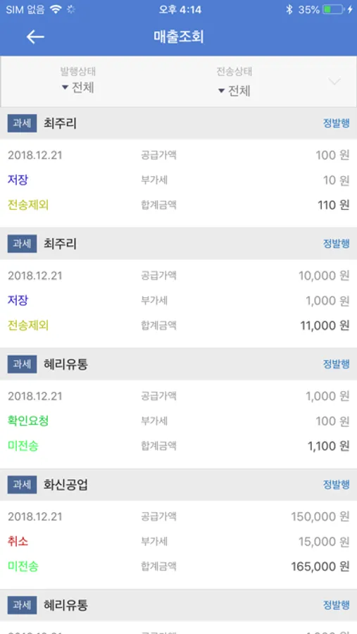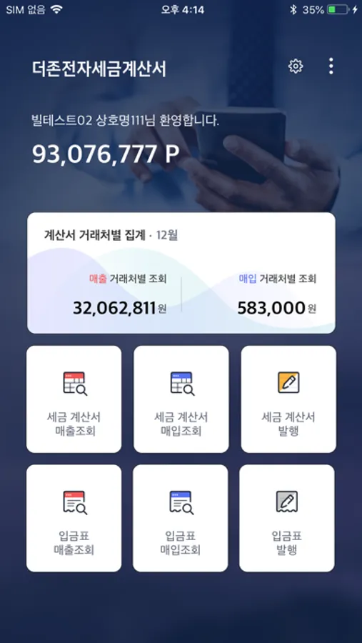 매출조회 : 스마트폰 또는 테블릿PC에서 발행 한 세금계산서 또는 PC(더존Bill36524)에서 발행 한 전자세금계산서를 확인 및 관리 하는 메뉴 입니다.