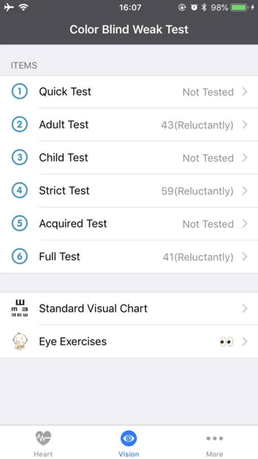 It also includes 6 types, hundreds of color blind color detection patterns, standard eye chart, eye exercises and so on.