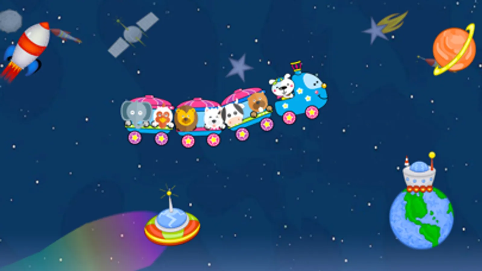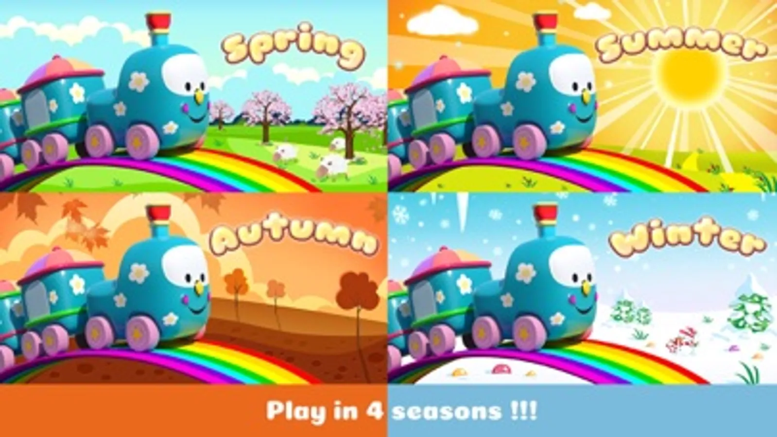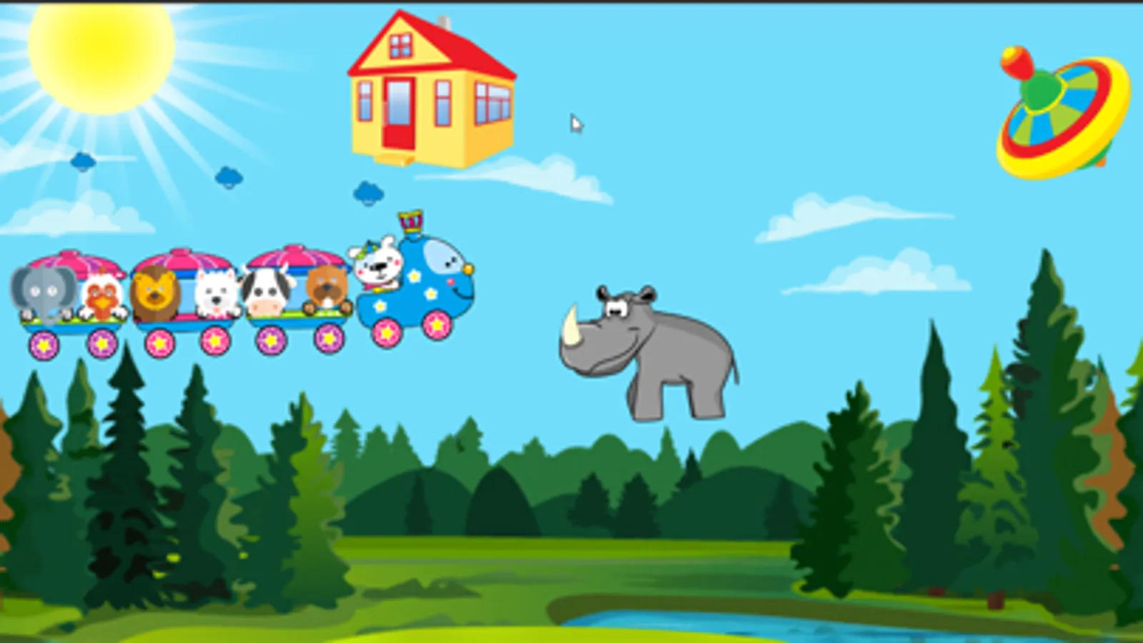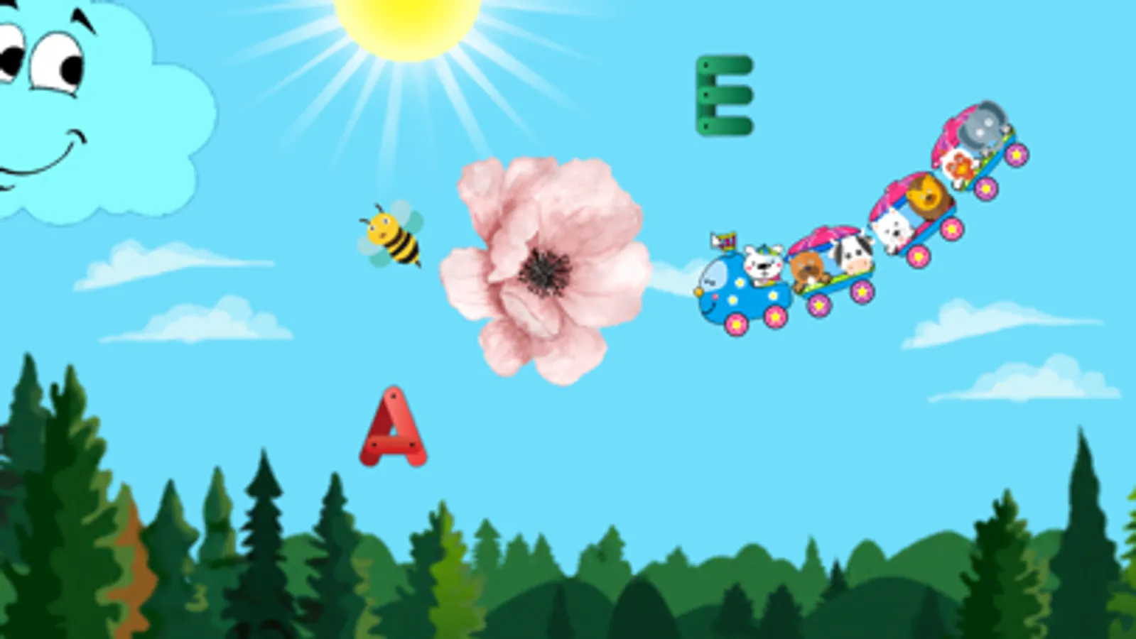 Funny animals get on the train and start an interactive journey full of adventures! Learn as you go: discover the English alphabet by listening to how letters and the associated words are pronounced, explore different natural phenomena like rain, lightning, rainbow and more! Simply bump into the objects to learn new things.
