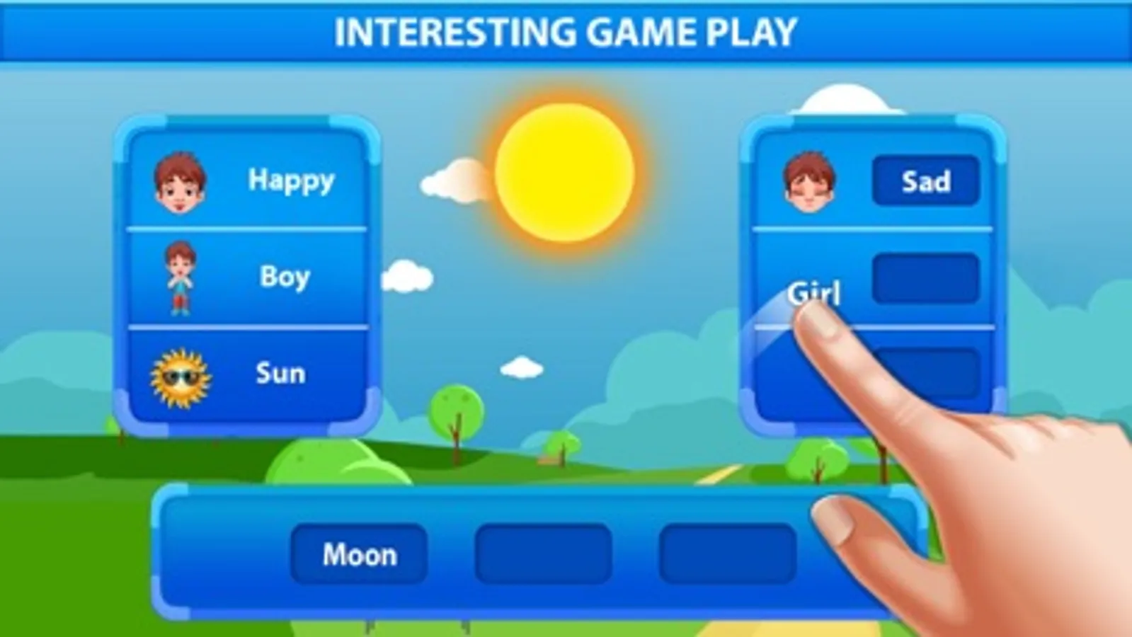 The game is designed to teach kids some common opposite words. Kids will learn to identify and recall opposite words through simple matching games, in which they have to match the words to their opposites. Kids will enjoy playing this exciting fun learning opposites games!