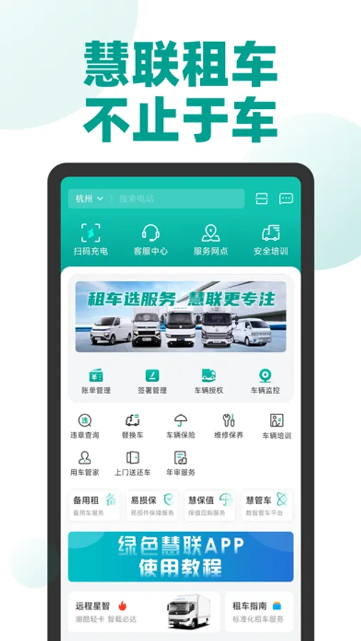 “绿色慧联APP”是绿色慧联为服务用户而开发的移动客户端,用户可通过APP获得找桩充电、线上租车、查违章、查维保、查年审、查车况等服务。