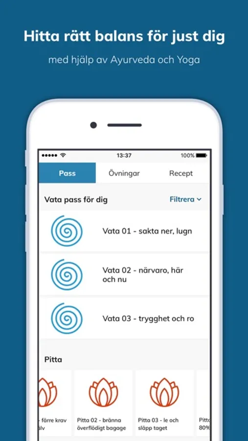 Det finns flera färdiga pass, de flesta är mellan 15 – 30 min långa, som är benämnda Vata, Pitta och Kapha. Men om du hellre vill skapa dina egna pass finns den möjligheten. Du har tillgång till ett övningsbibliotek där du kan filtrera på respektive dosha och på t.ex. lugn, vitalitet, fokus, energi. Om du vill genomföra specifika övningar under en länger tid än de tre förinställda minuterna, så går det fint. Appen innehåller även en receptdatabas för att inspirera till näring som är bra för dig.