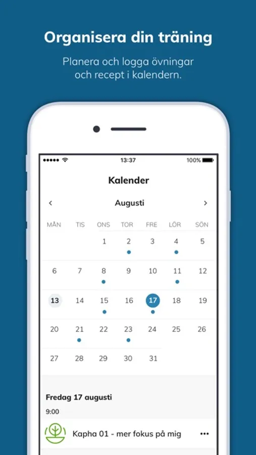 I kalendern har du möjlighet att planera pass, övningar och recept. Självklart kan du logga övningarna, passen och recepten, både med känsla före och efter, samt lägga till egen kommentar om hur du upplevde passet etc.