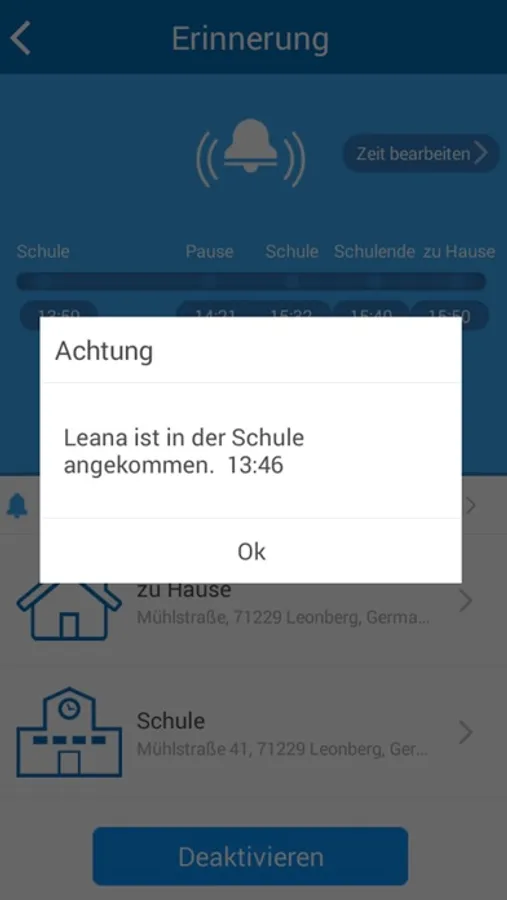 Dank der GPS-Ortung in Echtzeit wissen Sie zu jeder Zeit, wo sich Ihr Kind genau befindet. Durch die Zieleingabe werden Sie via Push-Nachricht automatisch darüber informiert, sobald Ihr Kind an dem ausgewählten Ort angekommen ist. Die zurückgelegte Strecke können Sie in der Historie verfolgen.