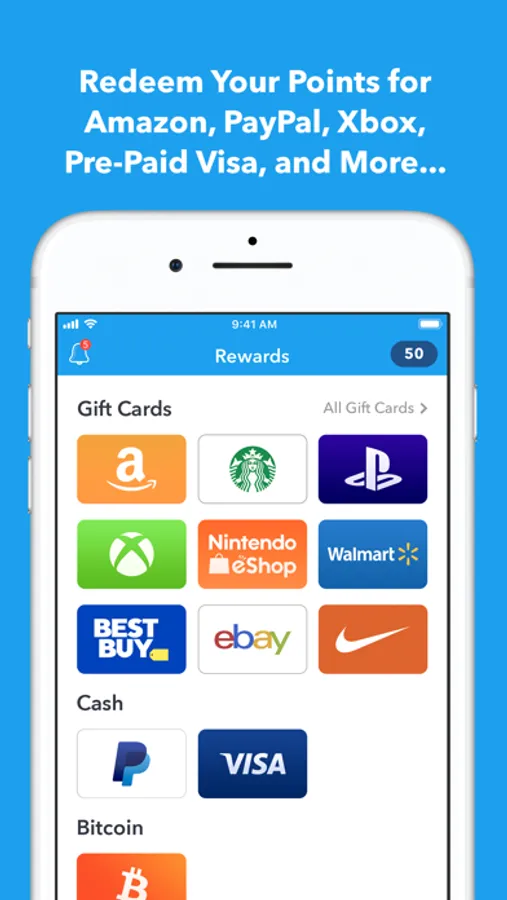 Use your points to get rewards including PayPal cash, Visa pre-paid cash, or Amazon, Xbox, PlayStation, Nintendo eShop, Starbucks gift cards and more...