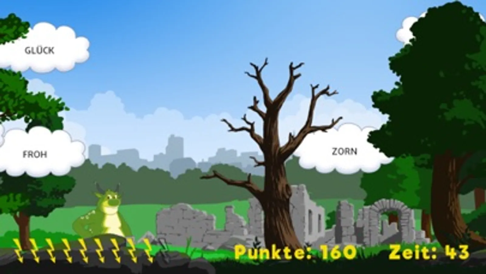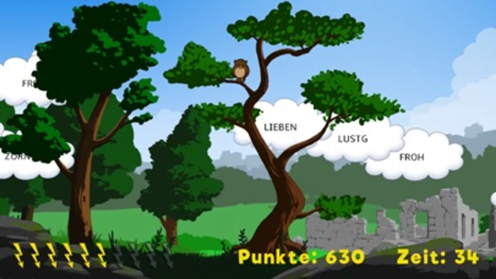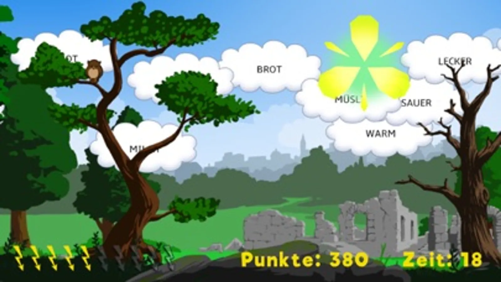 Du kannst leicht, mittel oder schwer spielen. In drei aufeinanderfolgenden Runden blitzt du möglichst viele Wortwolken mit der einmal ausgewählten Wortart. Aber Vorsicht: Wenn du ein Wort einer falschen Wortart gejagt hast, gibt es Minuspunkte! Blitzt du Lurs, der ab und zu hinter einer Ruine oder vor einem Busch auftaucht, gibt es dagegen Extra-Punkte.
