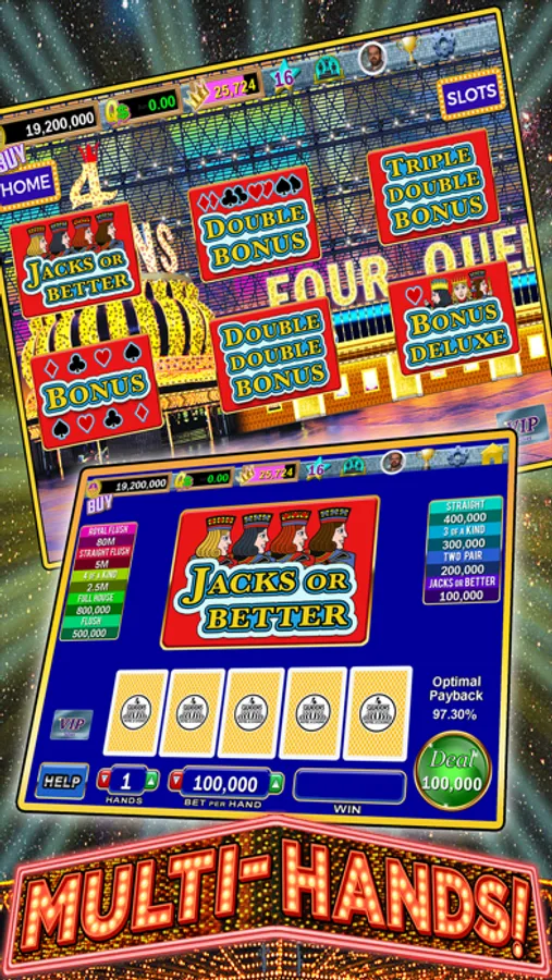 Four Queens Casino is loaded with 11 Multi-Hand VIDEO POKER titles -- including 2 never-before-seen Binion's specials -- each with up to 10 hands at the same time! Play the most popular games -- like those in every Las Vegas casino -- Jacks or Better, Bonus Poker, Double Bonus Poker, Double Double Bonus Poker, Triple Double Bonus Poker, Bonus Deluxe Poker, Deuces Wild, Bonus Deuces Wild and even Double Bonus Deuces Wild!