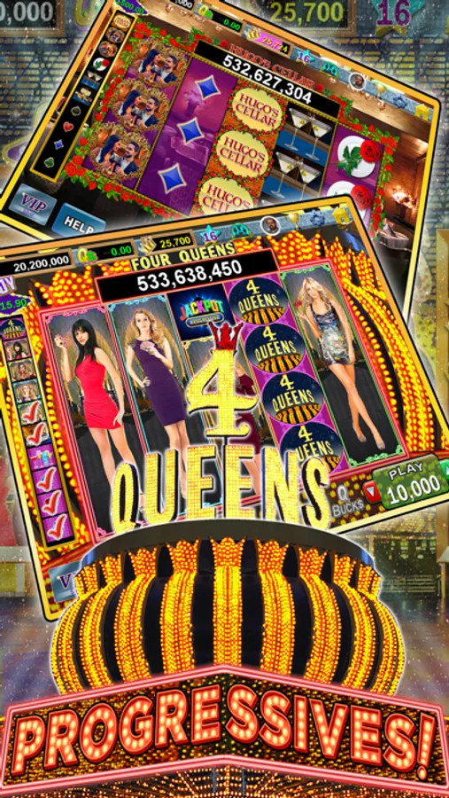 Second, with Four Queens Casino you get the excitement of the famous Las Vegas casino right at home! Play "Four Queens"TM or "Hugo's"TM, each with a progressive starting at 500 Million Coins! PLUS, you can collect Crowns for real PRIZES! Join the slots party with fun machines and amazing bonus games created by professional Vegas slot designers!