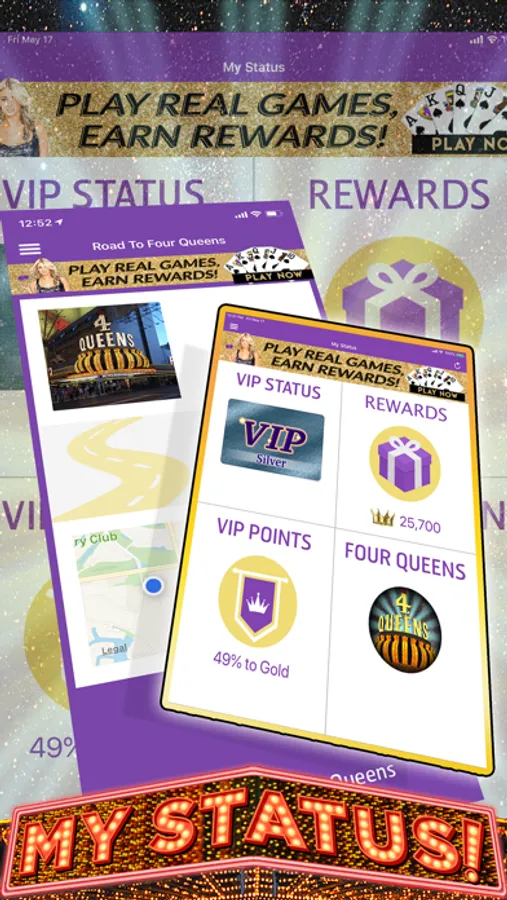 First, rock with Four Queens! Even if you're not with us, find out how far away you are, what the weather's like in Vegas and book a room! Find out what's happening with current deals & promotions. And, through the My Status page, instantly check your VIP status and PRIZES you've earned!