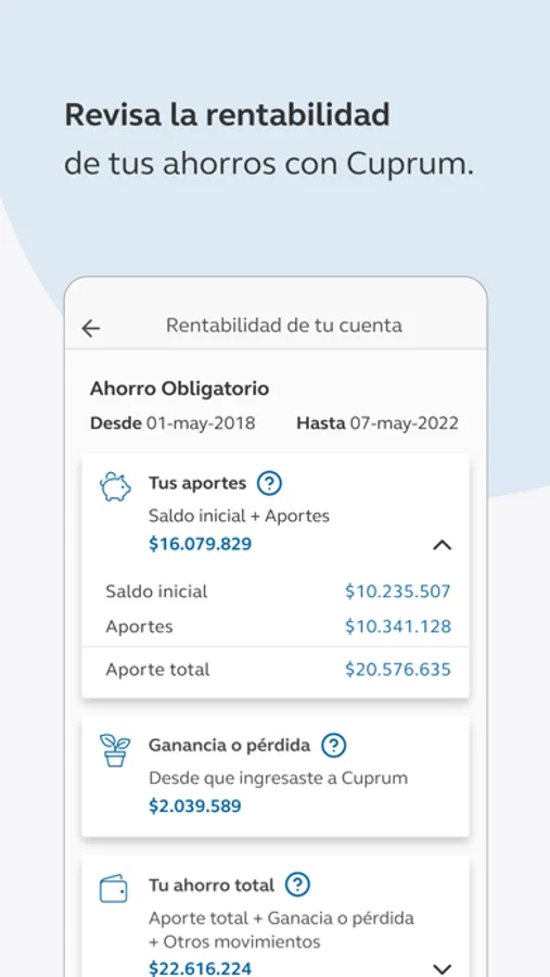 -Conocer la rentabilidad de tu cuenta. Puedes revisar cuál ha sido la ganancia o pérdida que has obtenido desde que ingresaste a Cuprum en Ahorro Obligatorio y APV.
