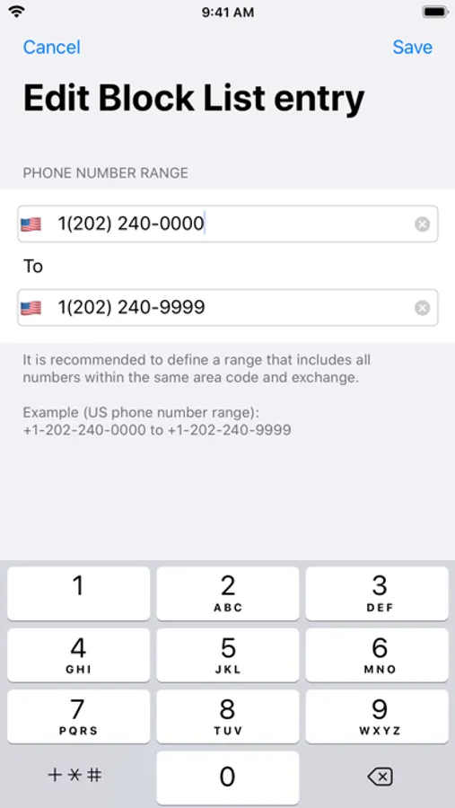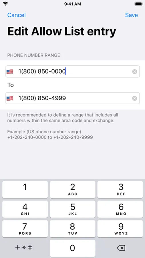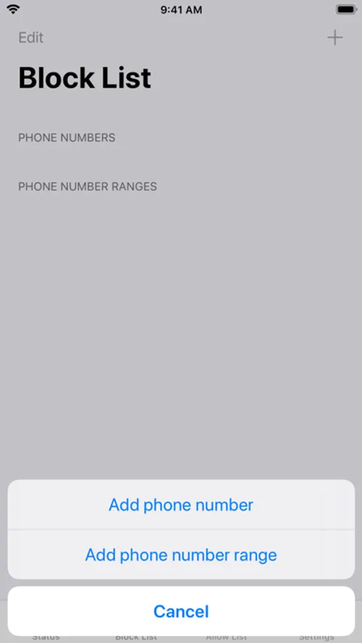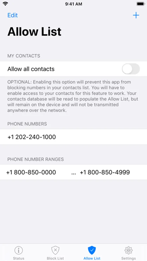 You may also add individual numbers or ranges of numbers to the Allow List, so that they will not be blocked by this app, even if they are in the Block List. Optionally, you may also allow all of your phone's contacts.
