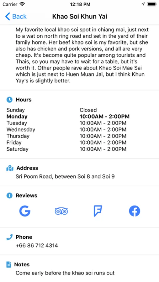 * Get directions, opening hours for today, add notes and track which places you've visited or want to check out