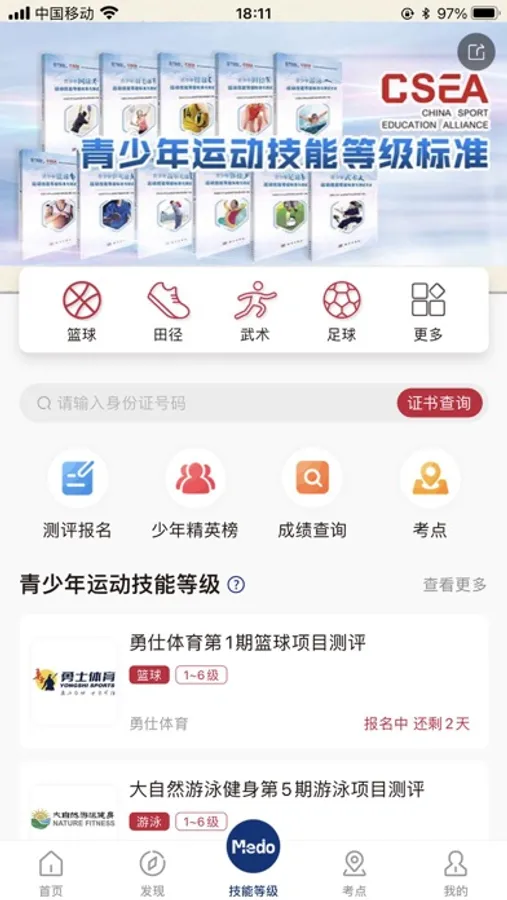 青少年通过MEDO体育APP可以搜索到各类体育项目的青少年体育冬夏令营、运动技能等级考评、U系列赛事,为青少年提供最全面的体育资讯,培养青少年对体育运动的兴趣,逐渐形成乐趣,最后达到志趣的目标。