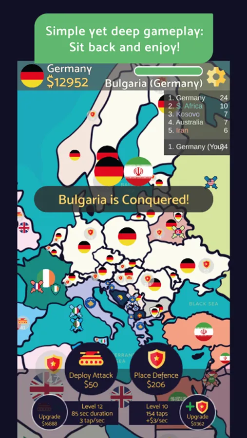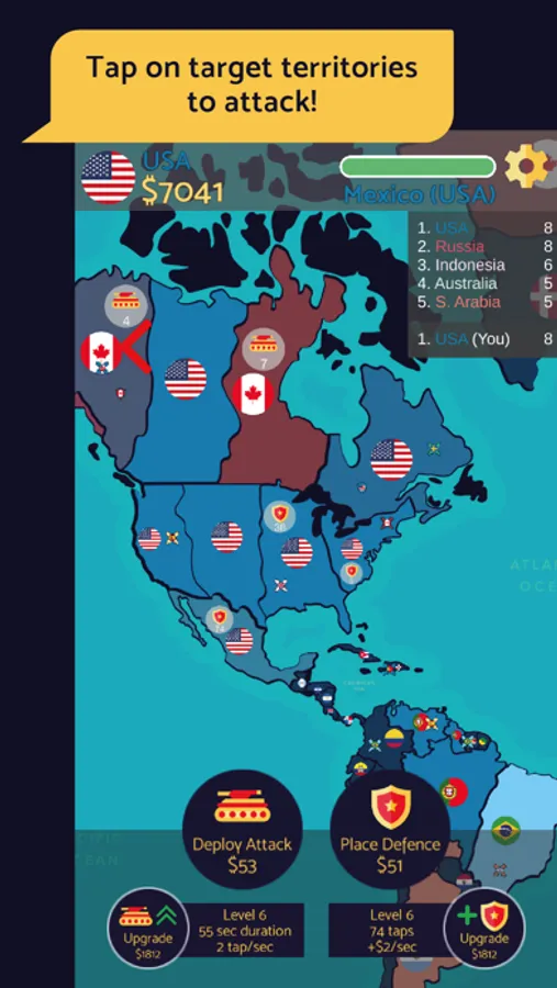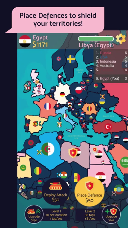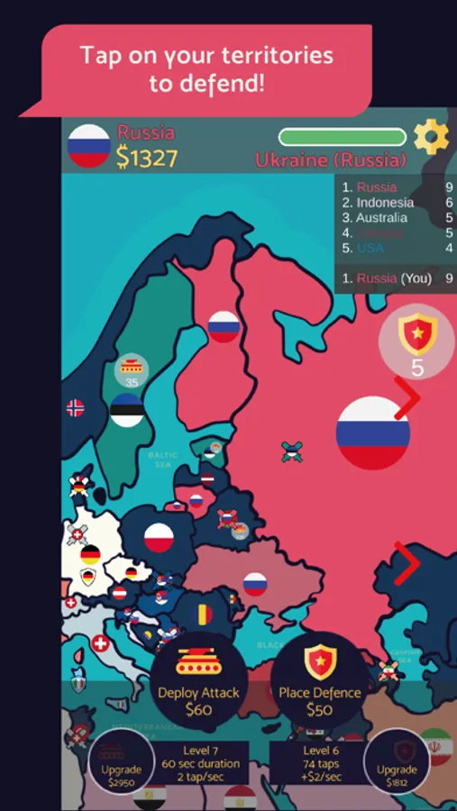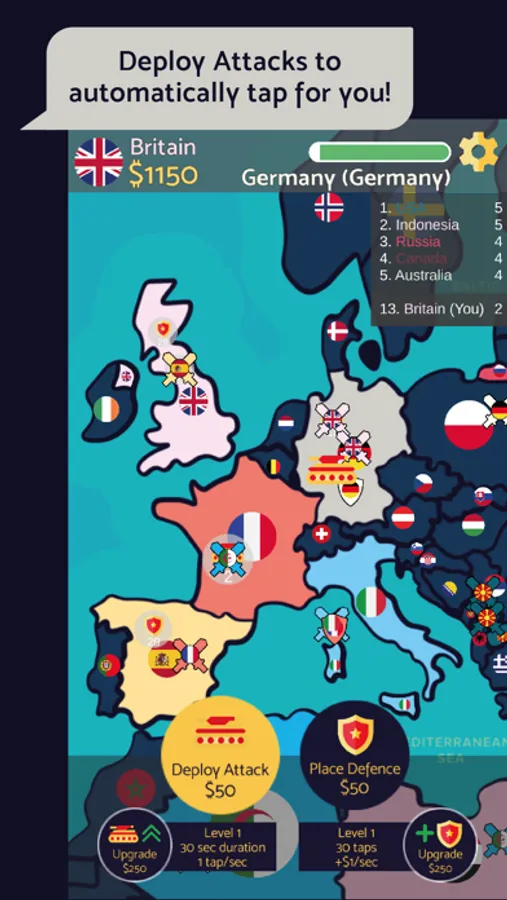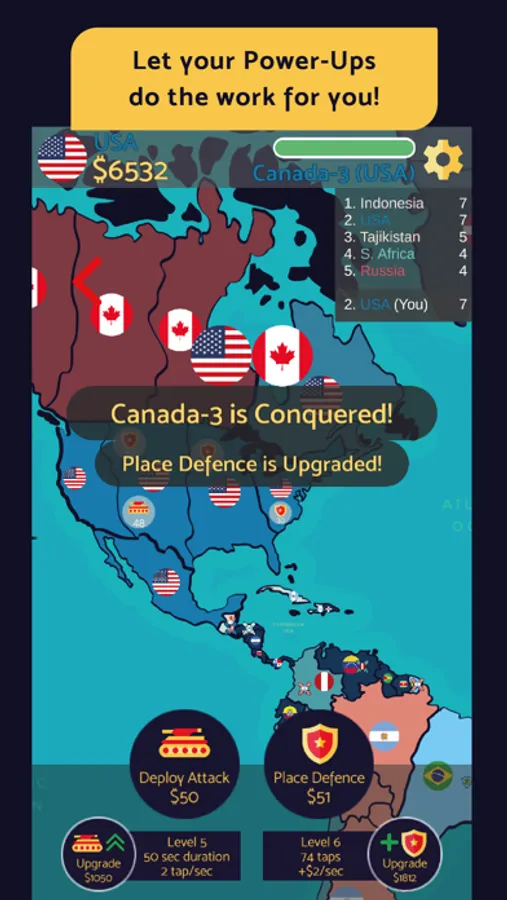 Go idle after you use your offensive and defensive power-ups, and let them do the work for you. Just sit back, and watch as you dominate. Or combine everything all together and storm the tap-world!