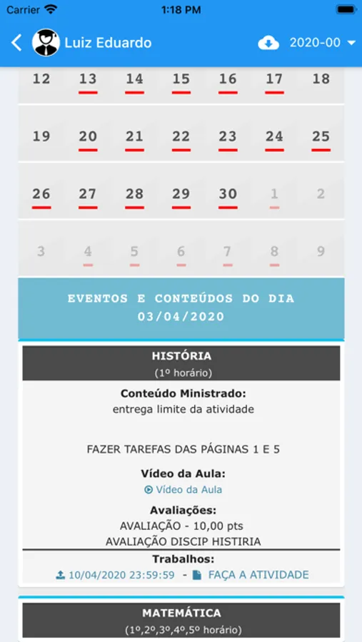 Aulas - conteúdos, horários e datas de entrega visíveis na tela;