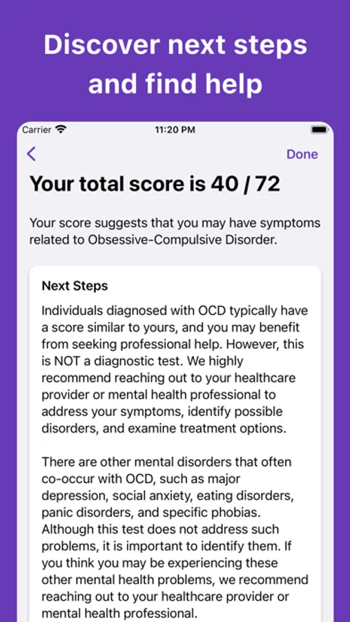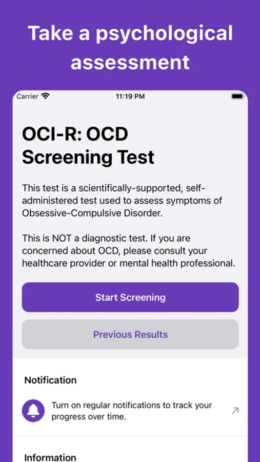 This app is designed to evaluate your symptoms of OCD with a scientifically-supported 18-question test. It uses the Obsessive-Compulsive Inventory - Revised (OCI-R), a screening questionnaire for OCD that is commonly used in research and healthcare settings. The OCI-R is also helpful for monitoring your OCD-related symptoms during and after treatment.