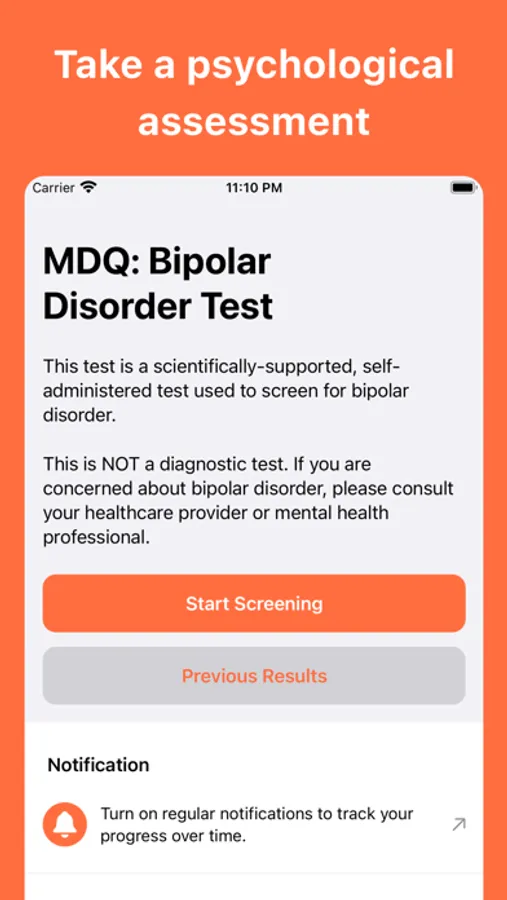 - Start Test: take the MDQ questionnaire to screen for bipolar disorder