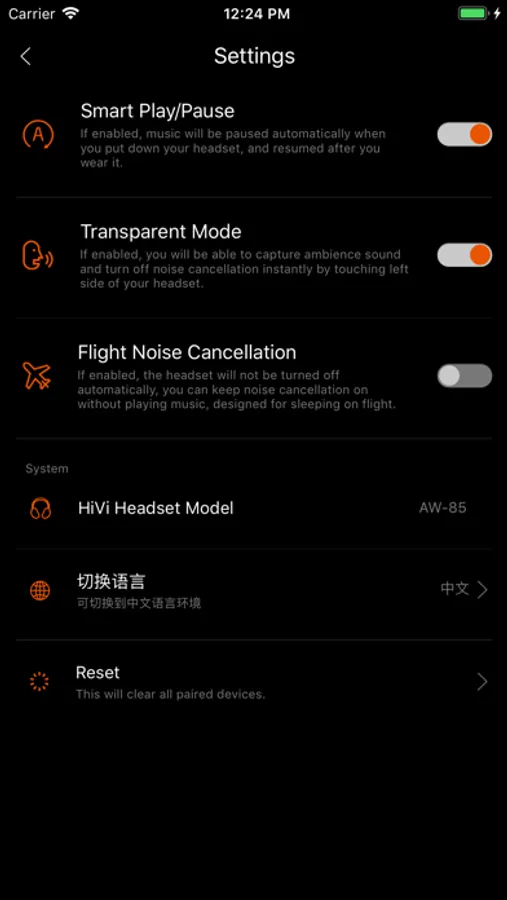 With HiVi Connect, user can connect iPhone with HiVi AW-85 headset via bluetooth, and control functions of the headset, including noise cancellation, ambience sound amplifying, and equalizers.