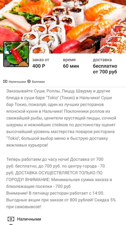 Суши бар "Токио" - это один из лучших ресторанов японской кухни в Нальчике! Поклонники роллов из свежайшей рыбы, ценители хрустящей пиццы, сочной шаурмы и нежнейших стейков по достоинству оценят высочайший уровень мастерства поваров ресторана "Токио", большой выбор меню и быструю доставку вежливых курьеров!