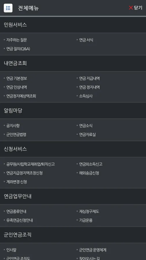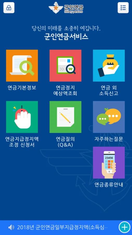 군인연금 모바일앱은 민원신청, 내연금조회, 알림마당 등 군인연금 관련 정보를 제공합니다.