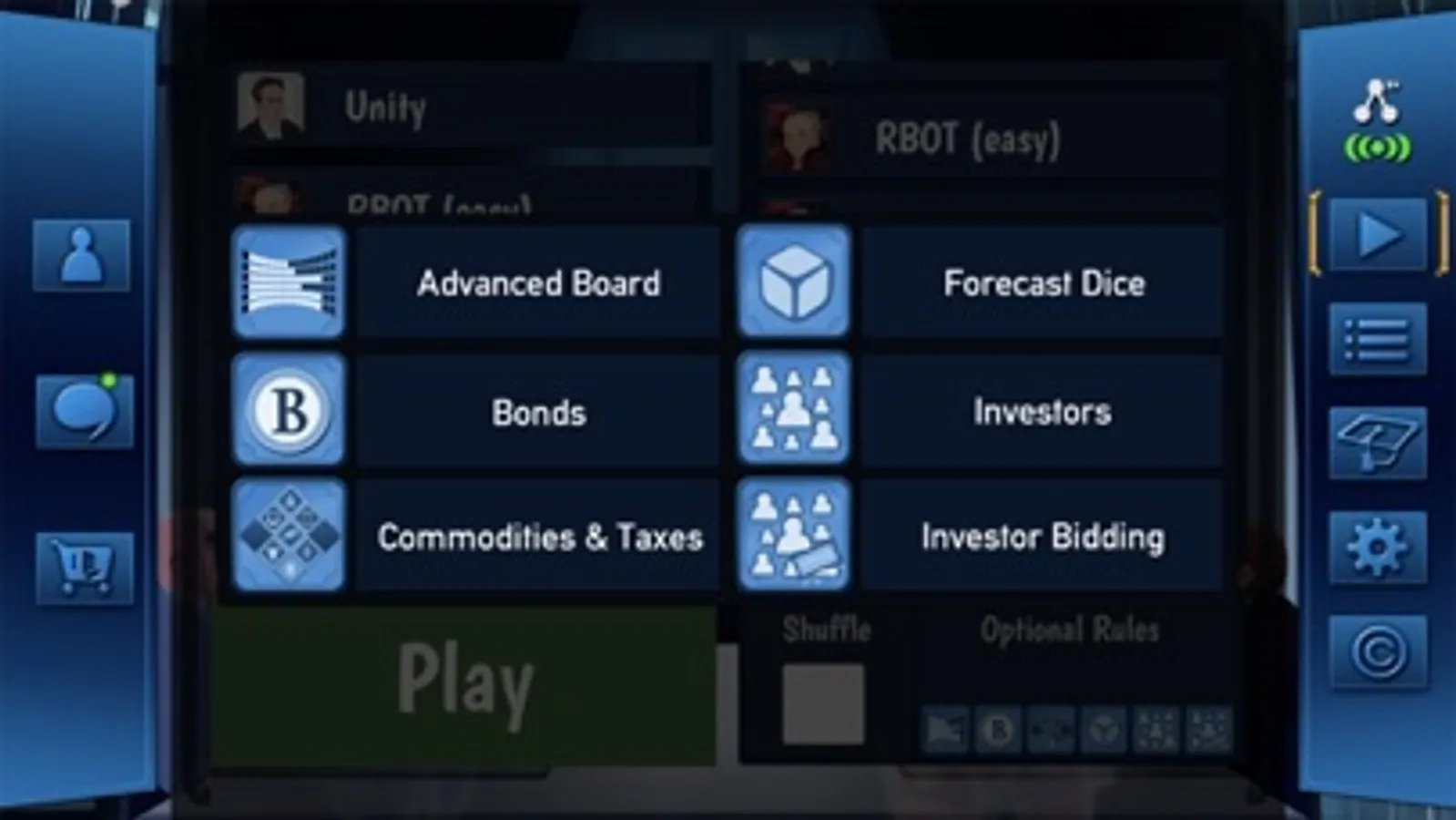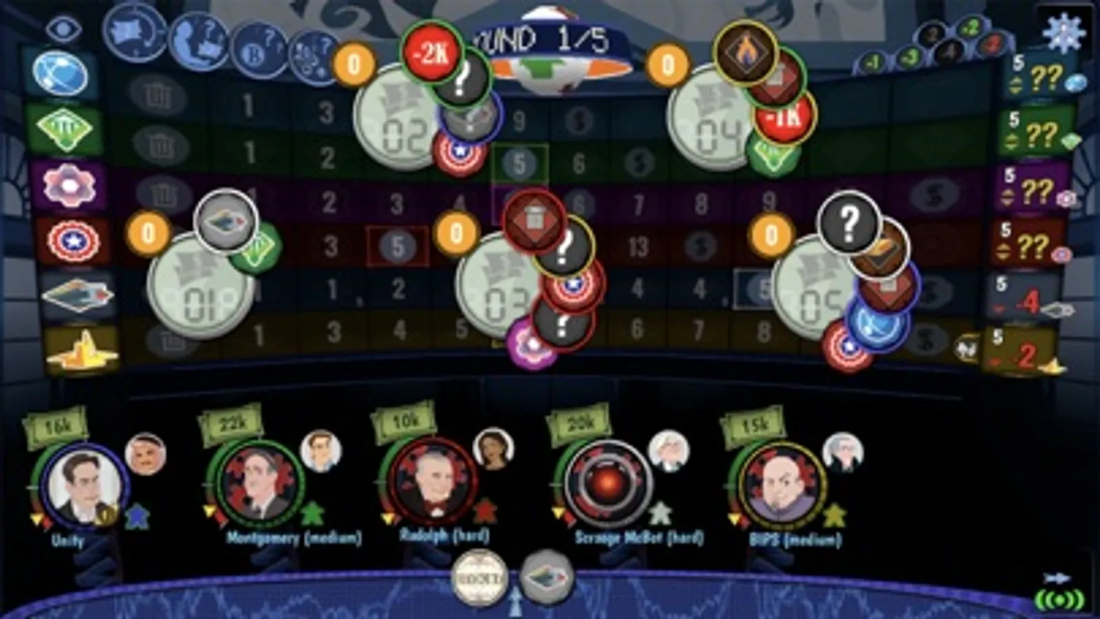 Both of these mechanisms are combined with some stock market elements to make players consider multiple factors when selling a stock. Do you hold onto a stock in hopes of catching a lucrative stock split or do you sell now to avoid the potential company bankruptcy? Can you hold onto your stock until the end of the game to become the majority shareholder, or do you need the liquidity now for future bidding? Do you risk it all by investing heavily into one company, or do you mitigate your risk by diversifying your portfolio?