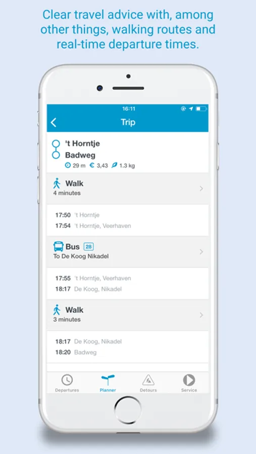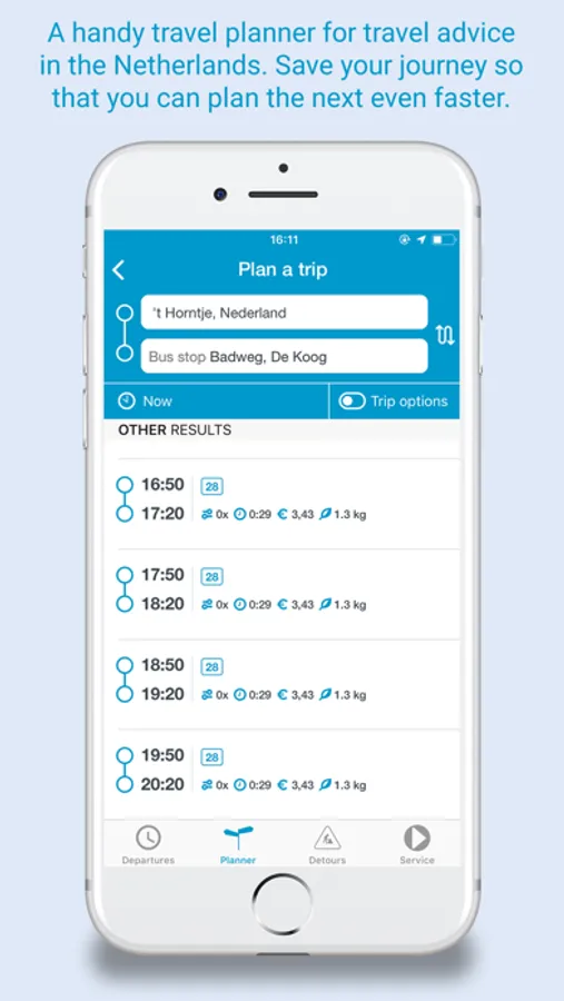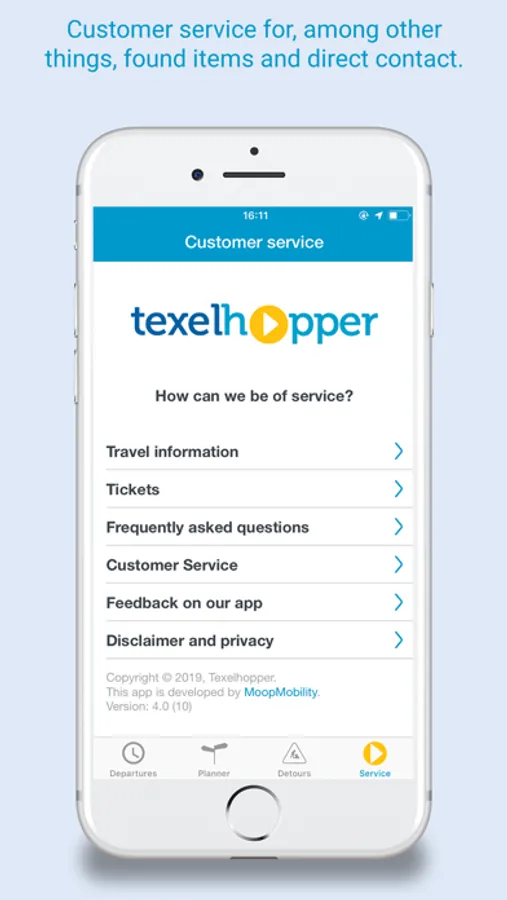 In this app, you can plan your journey from A to B, reserve a ride on one of the Texelhopper mini-buses, see current travel information, and contact Customer Service.