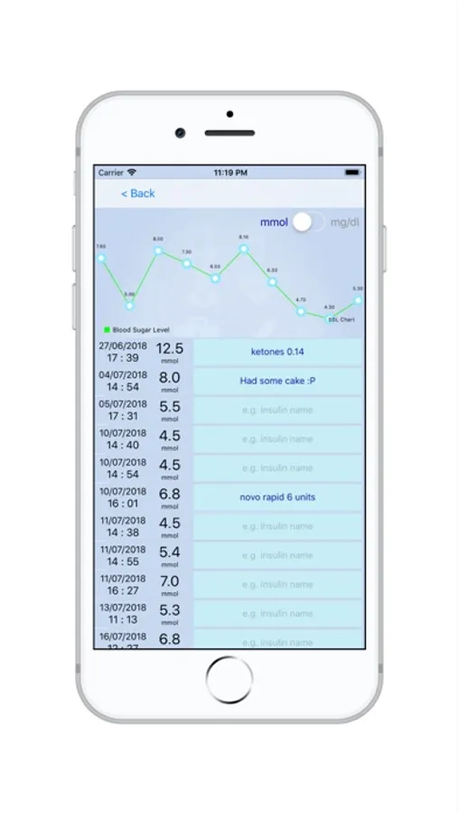 - Statistics: See your last 10 BSL records on a line chart to evaluate your average BSLs and sort out any abnormal fluctuations that could be the first indication of a poorly controlled Diabetes.