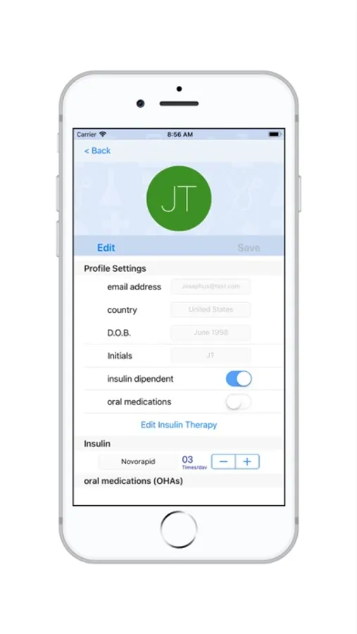 - Settings: Keep your personal data updated with your current Insulin and/or Oral therapy.