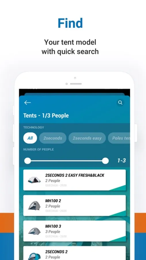 2) Find your Decathlon tent or shelter models among all those present thanks to our simplified search system. You can discover all the details of your tent (videos, photos, technical specifications, dimensional diagrams, etc.) and share them with a friend.