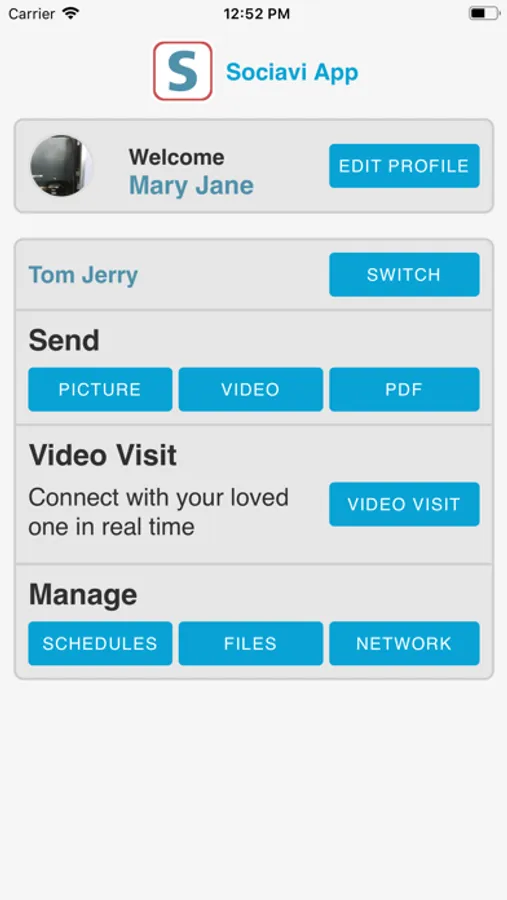 With the Sociavi Companion App, you can send pictures, videos and have real-time Sociavi video visits with your loved one through their Sociavi’s DHC.
