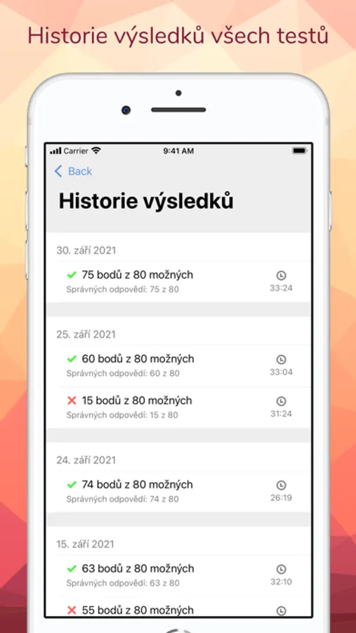 • Možnost prohlédnout si historii výsledků absolvovaných testů